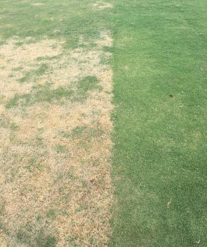 | Latitude 36 Bermuda grass (left) is tested against TifTuf Bermuda grass (right) under same drought conditions in the spring of 2017 on the Outback Field at IPC. |