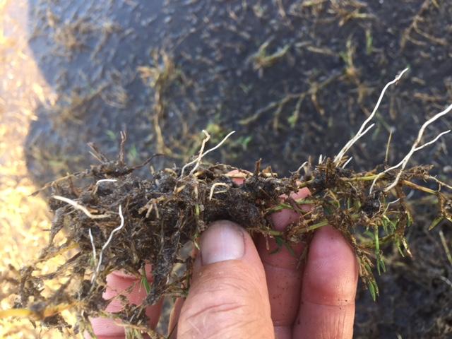 | Raymond Mooney, Head Agronomist at IPC, shows off the deep roots of the already growing TifTuf Bermuda grass only a few days after seeding the fields at IPC. |